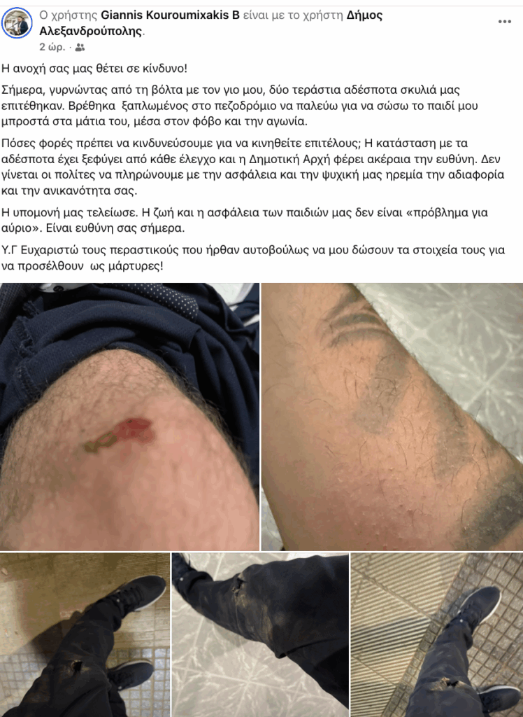 Σοκ και ανησυχία προκαλεί η δημόσια καταγγελία πολίτη της Αλεξανδρούπολης, ο οποίος περιέγραψε στα κοινωνικά δίκτυα την εφιαλτική στιγμή που δύο μεγαλόσωμα αδέσποτα σκυλιά επιτέθηκαν στον ίδιο και τον ανήλικο γιο του.