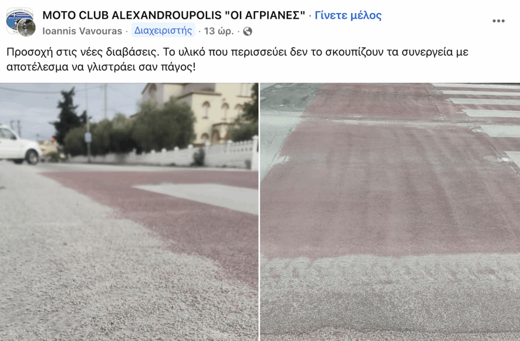 Ανησυχία προκαλεί ανάρτηση της ομάδας MOTO CLUB ALEXANDROUPOLIS “Οι Αγριάνες”, σύμφωνα με την οποία το υλικό που χρησιμοποιήθηκε στις νέες διαβάσεις δημιουργεί συνθήκες ολισθηρότητας για τα δίκυκλα.