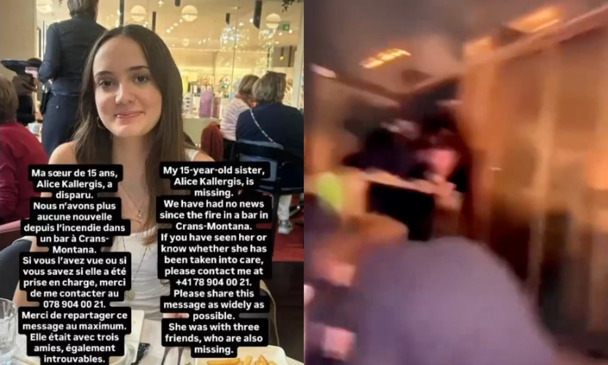 Σε αγώνα δρόμου για τον εντοπισμό μιας ανήλικης ελληνικής καταγωγής έχουν επιδοθεί συγγενείς και φίλοι της μετά την καταστροφική πυρκαγιά στο μπαρ «Le Constellation» στο χιονοδρομικό Κραν Μοντανά της Ελβετίας, τη νύχτα της Πρωτοχρονιάς. Η 15χρονη Αλίκη Καλλέργη (Alice Kallergis), μόνιμη κάτοικος Ελβετίας με διπλή ελληνική και ελβετική υπηκοότητα, βρισκόταν στο κατάμεστο κλαμπ μαζί με τρεις φίλες της όταν ξέσπασε η φωτιά γύρω στις 01:30 τοπική ώρα (02:30 ώρα Ελλάδας).