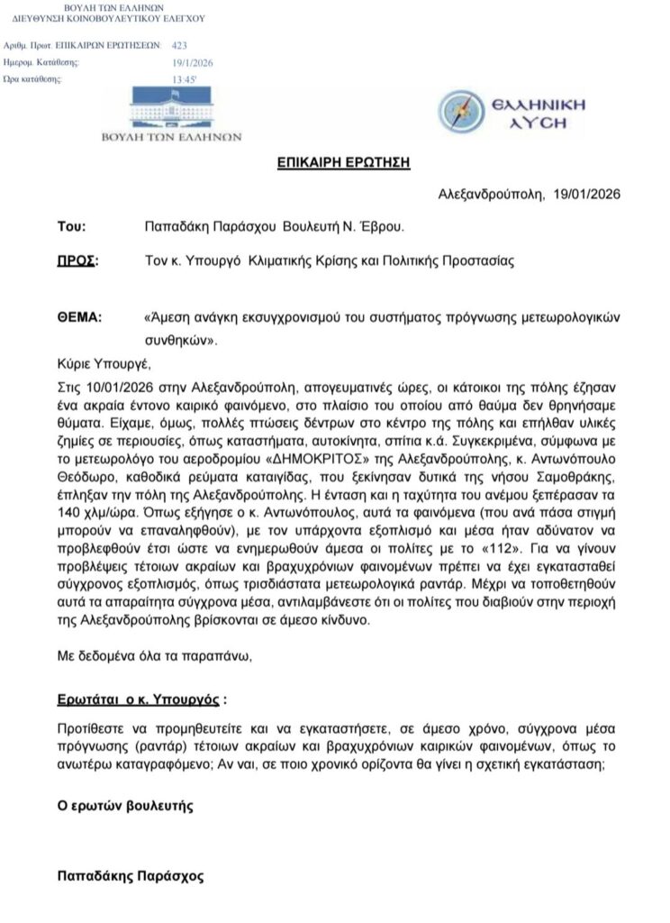 Την παρέμβαση κάνει με Επίκαιρη Ερώτηση ο Βουλευτής Έβρου της Ελληνικής Λύσης, Πάρης Παπαδάκης (κατάθεση: 19/01/2026, αριθμ. πρωτ. 423) προς τον Υπουργό Κλιματικής Κρίσης και Πολιτικής Προστασίας, θέτοντας ως κεντρικό θέμα την «άμεση ανάγκη εκσυγχρονισμού του συστήματος πρόγνωσης μετεωρολογικών συνθηκών».