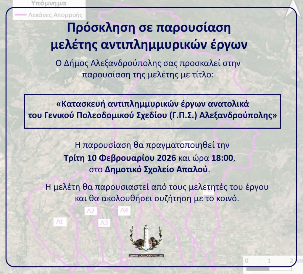 Ο Δήμος Αλεξανδρούπολης παρουσιάζει τη μελέτη αντιπλημμυρικών έργων ανατολικά του ΓΠΣ. Ανοιχτή εκδήλωση με συζήτηση πολιτών την Τρίτη 10/2/2026 στον Απαλό.