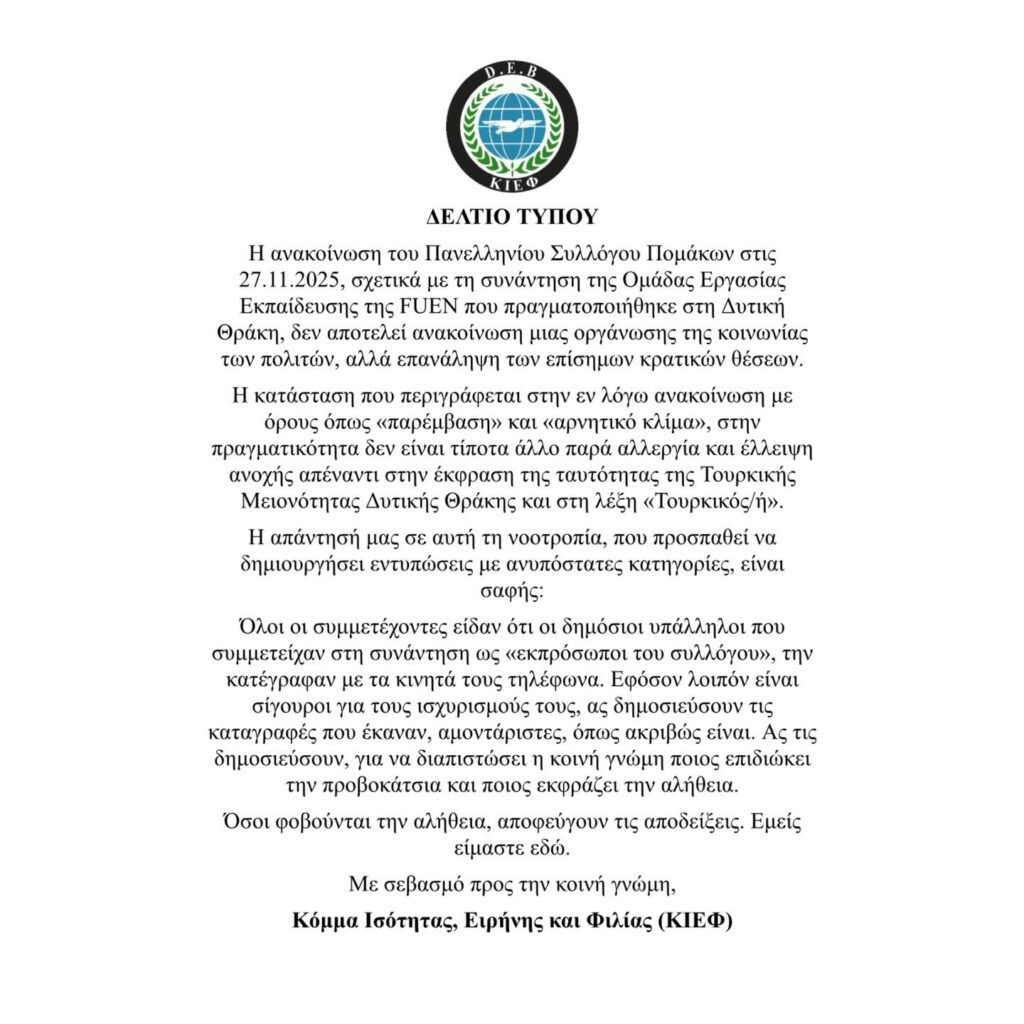 Οργισμένη ανακοίνωση από το Κόμμα Ισότητας, Ειρήνης και Φιλίας (ΚΙΕΦ) κατά του Πανελληνίου Συλλόγου Πομάκων – Μιλούν για «αλλεργία» στην… τουρκική ταυτότητα και απειλούν με «ηχογραφήσεις», επειδή οι Πομάκοι ύψωσαν ανάστημα για την καταγωγή τους.