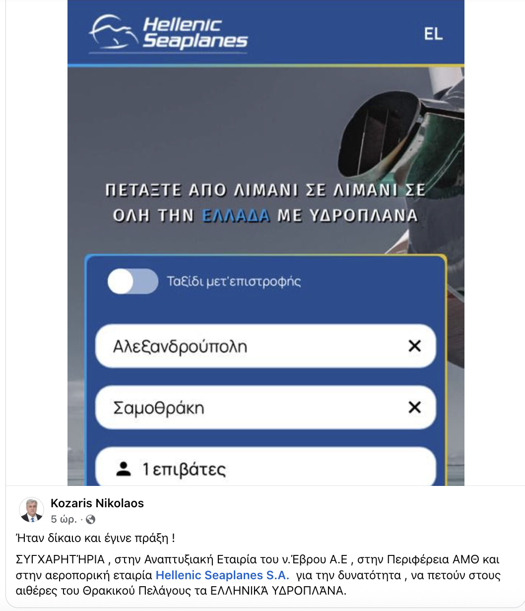 «Ήταν δίκαιο και έγινε πράξη!» γράφει γεμάτος ενθουσιασμό ο πρώην πρόεδρος της Αναπτυξιακής Εταιρείας Έβρου, Νίκος Κοζάρης, διαφημίζοντας την έναρξη των δρομολογίων υδροπλάνων της Hellenic Seaplanes μεταξύ Αλεξανδρούπολης και Σαμοθράκης….