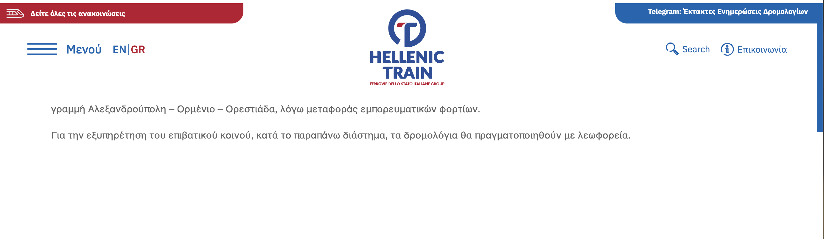 Διακόπτονται τα δρομολόγια στη γραμμή Αλεξανδρούπολη – Ορμένιο – Ορεστιάδα, από σήμερα, Τρίτη 21.01.2025, έως και το Σάββατο 25.01.2025, λόγω μεταφοράς εμπορευματικών φορτίων, σύμφωνα με ανακοίνωση της Hellenic Train.