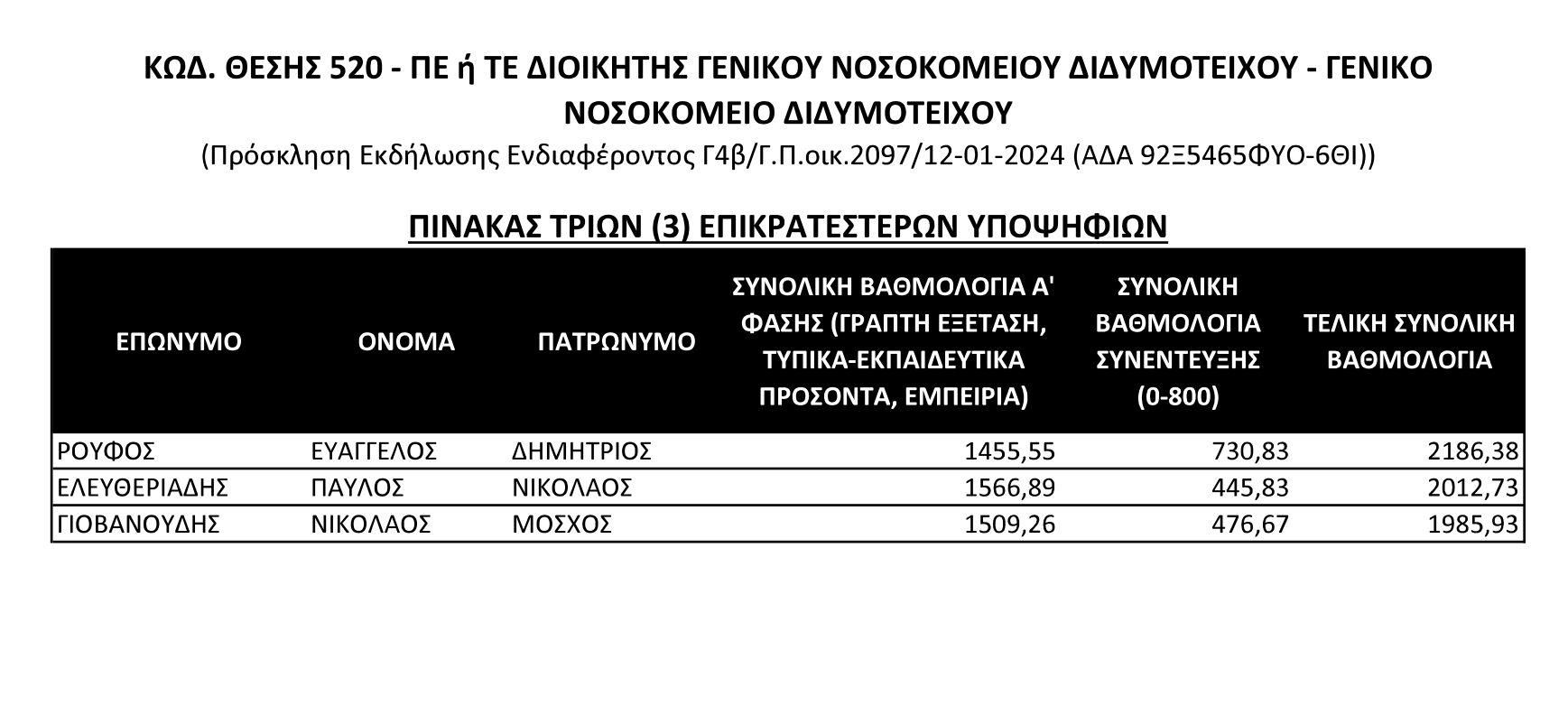 Ανακοινώθηκαν από το ΑΣΕΠ οι τελικές τριάδες με τους υποψήφιους διοικητές νοσοκομείων της 4ης ΥΠΕ Μακεδονίας και Θράκης, οι οποίες προέκυψαν έπειτα από τις προσωπικές συνεντεύξεις στις οποίες συμμετείχαν.