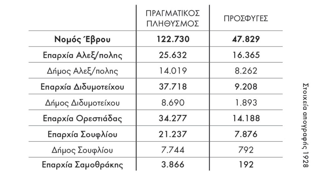 Το 39% του νομού ήταν πρόσφυγες, με 41% στην Ορεστιάδα και πάνω από 70% στις αγροτικές εκτάσεις της Αλεξανδρούπολης.