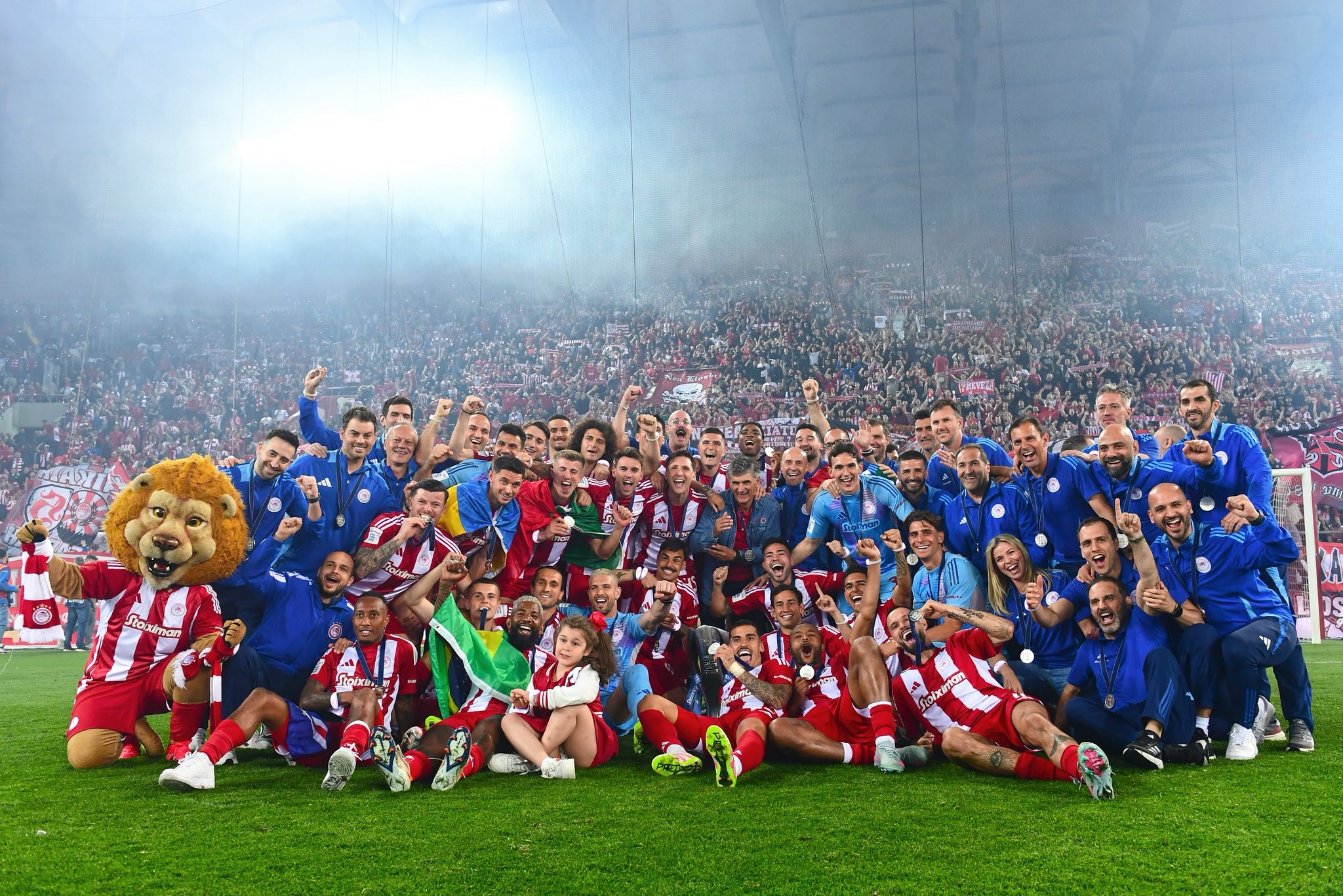 Το στάδιο φόρεσε τα… γιορτινά του, με βραχιόλια LED στις εξέδρες, εκατοντάδες καπνογόνα και βροχή από βεγγαλικά, ενώ υπό τους ήχους του “We Are the Champions” οι παίκτες, ο τεχνικός τιμ και ο Βαγγέλης Μαρινάκης ύψωσαν στον ουρανό του Φαλήρου το τρόπαιο της φετινής Super League.