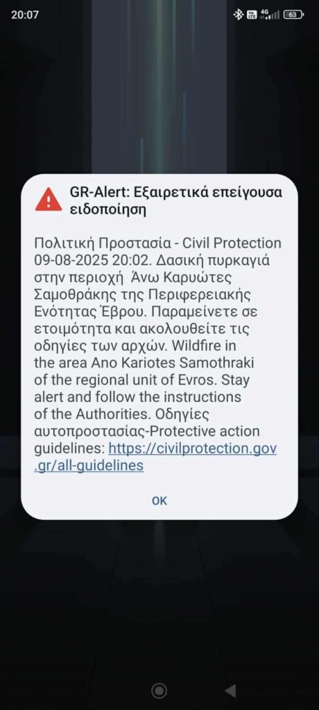 Συναγερμός έχει σημάνει στη Σαμοθράκη, καθώς μεγάλη πυρκαγιά ξέσπασε σήμερα (9 Αυγούστου 2025) στην περιοχή Καρυώτες, θέτοντας σε κίνδυνο κατοικίες και περιουσίες, ενώ μήνυμα 112 ήχησε σε κατοίκους και επισκέπτες. Επιπλέον, οι κάτοικοι αναφέρουν προβλήματα και με τις τηλεπικοινωνίες και την ηλεκτροδότηση, καθώς κάηκαν αρκετές κολώνες της ΔΕΗ.