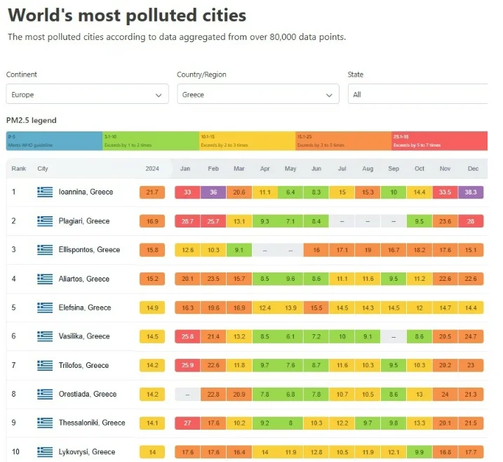 Οι 10 πιο μολυσμένες περιοχές στην Ελλάδα, σύμφωνα με την έκθεση της IQAir
