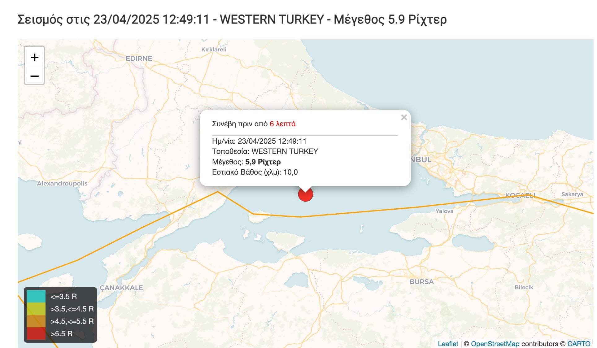 Αναστάτωση προκάλεσε νωρίς το μεσημέρι της Τρίτης (23/4) ένας ισχυρός σεισμός μεγέθους 5,9 Ρίχτερ, που σημειώθηκε στις 12:49 (ώρα Ελλάδας) στη Δυτική Τουρκία, κοντά στην περιοχή της Προποντίδας.