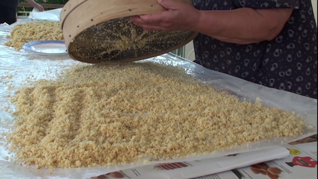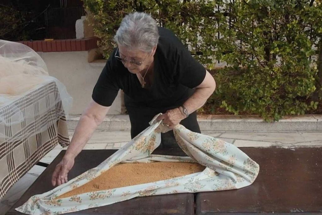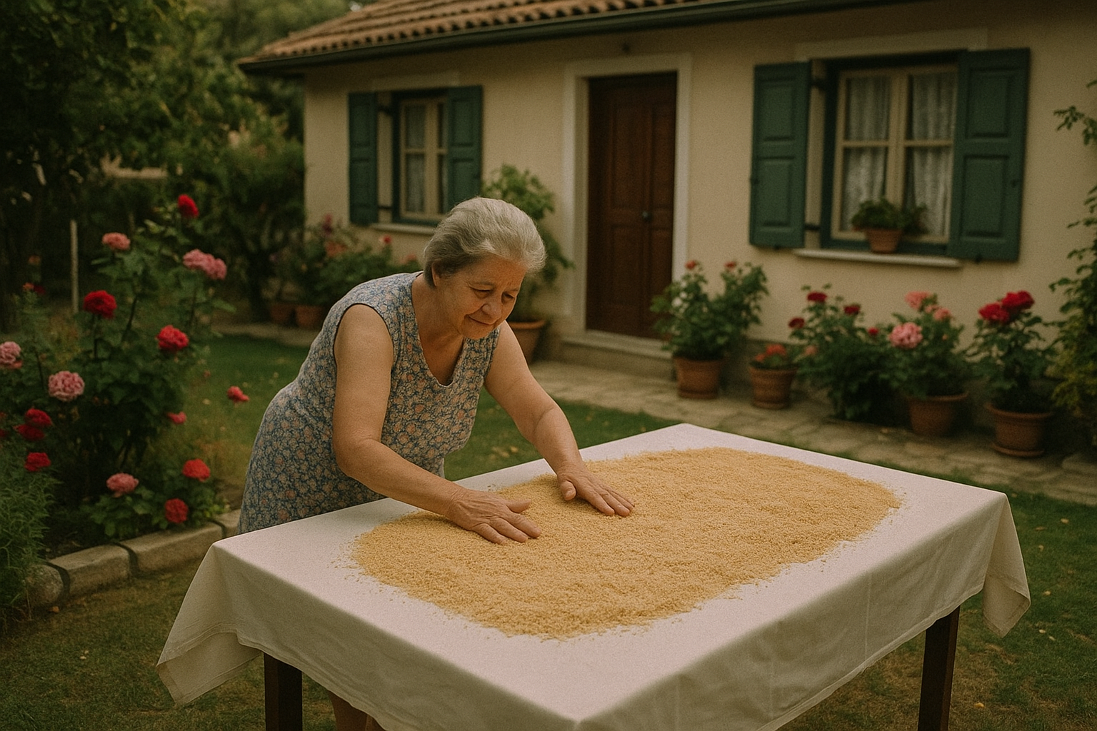 Μια γιαγιά με τσουγκράνα, να απλώνει το στάρι στον ήλιο. Άλλη, να διπλώνει το πανί με το χοντροκομμένο τραχανά.