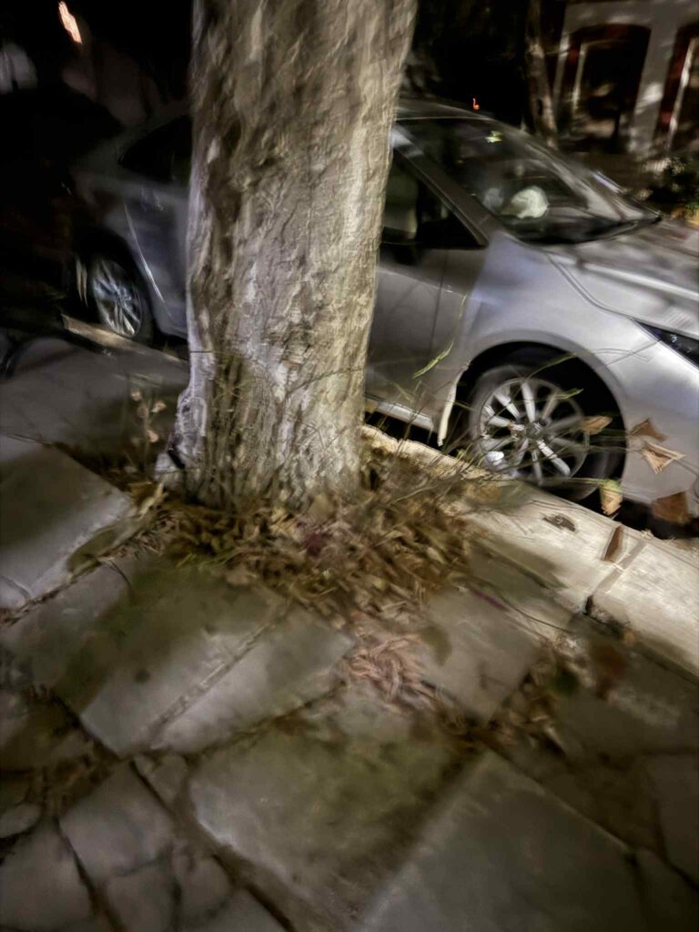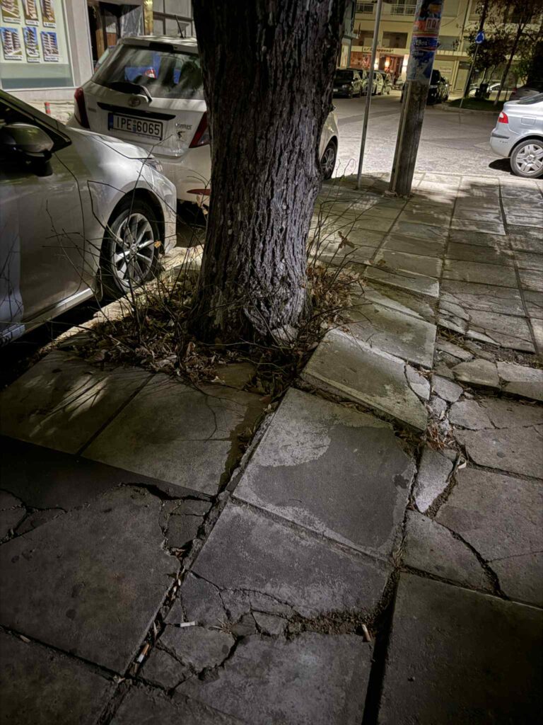 Οι φωτογραφίες που έστειλε αναγνώστρια στο pameevro.gr αποτυπώνουν την τραγική κατάσταση του πεζοδρομίου επί της οδού Κίου, με σηκωμένες πλάκες από τις ρίζες των δέντρων, ρωγμές παντού, σπασμένα τμήματα που παραμονεύουν κάτω από τα πόδια κάθε πεζού. Το βράδυ, η εικόνα γίνεται ακόμη πιο επικίνδυνη, αφού ο φωτισμός είναι από ελλιπής έως ανύπαρκτος, αφήνοντας τα προβληματικά σημεία στην… τύχη όποιου περάσει.