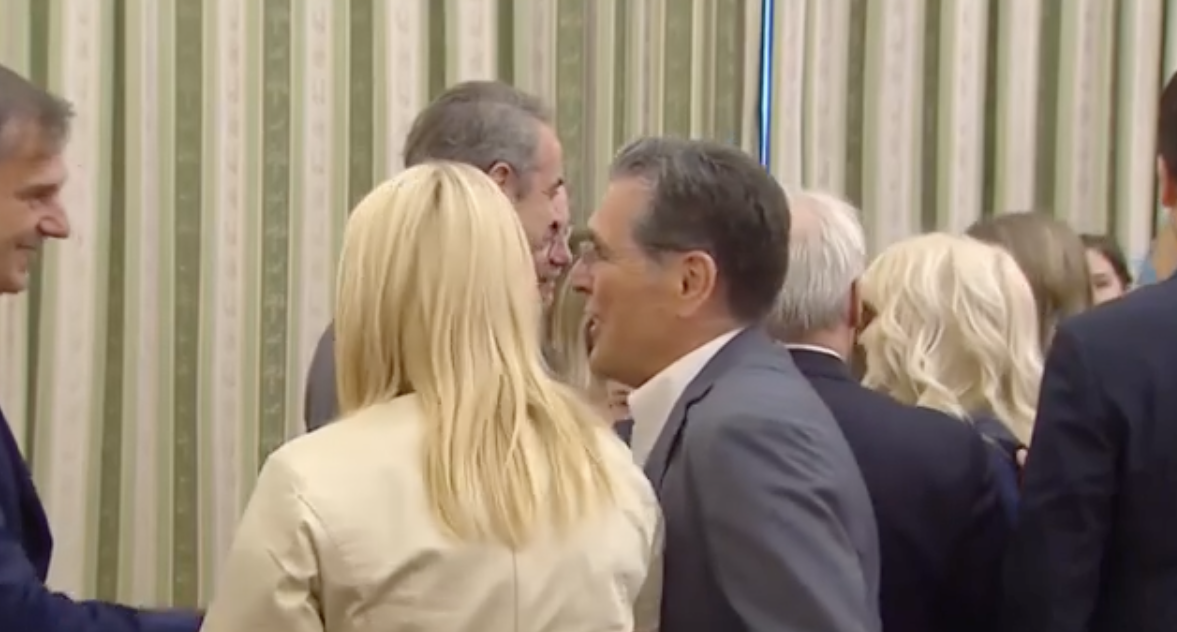 Στον εσωτερικό χώρο του Προεδρικού, οι χειραψίες έδιναν και έπαιρναν όπως και τα θερμά βλέμματα, οι ευχές και μια αγκαλιά που δεν πέρασε απαρατήρητη: η σύντροφός του Χρήστου Δερμεντζόπουλου, τον αγκάλιασε στιγμιαία με τρυφερότητα, αμέσως μετά την ορκομωσία του.