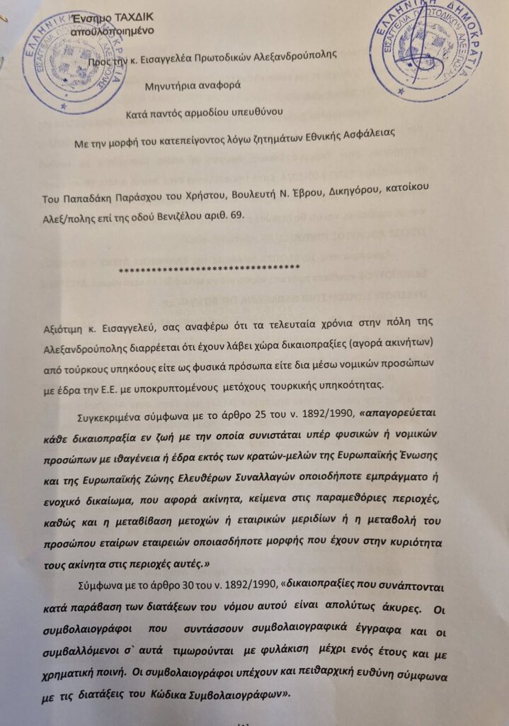 Μηνυτήρια αναφορά προς την κ. Εισαγγελέα Πρωτοδικών Αλεξανδρούπολης υπέβαλε ο βουλευτής Έβρου της Ελληνικής Λύσης, Πάρης Παπαδάκης, ζητώντας να διερευνηθούν σε βάθος οι καταγγελίες για αγορές ακινήτων στην πόλη και στην ευρύτερη παραμεθόριο από Τούρκους υπηκόους ή νομικά πρόσωπα με τουρκική συμμετοχή.