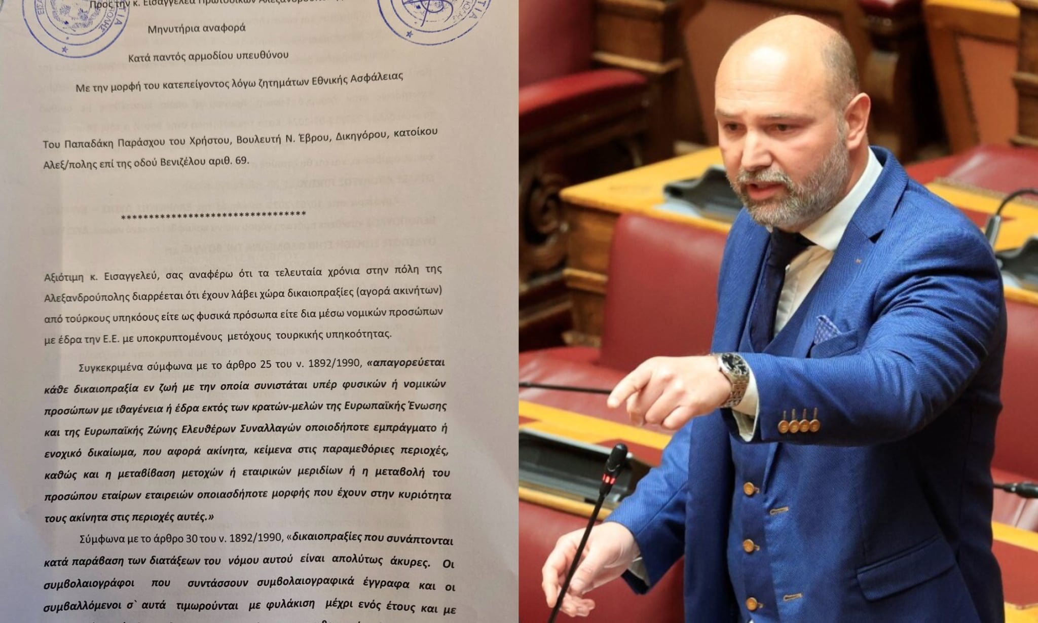 Ο βουλευτής της Ελληνικής Λύσης ζητά εισαγγελική διερεύνηση για μεταβιβάσεις σε παραμεθόριες περιοχές, επικαλούμενος τον νόμο 1892/1990 περί εθνικής ασφάλειας και απειλώντας με ακυρότητα συμβολαίων και ποινικές ευθύνες