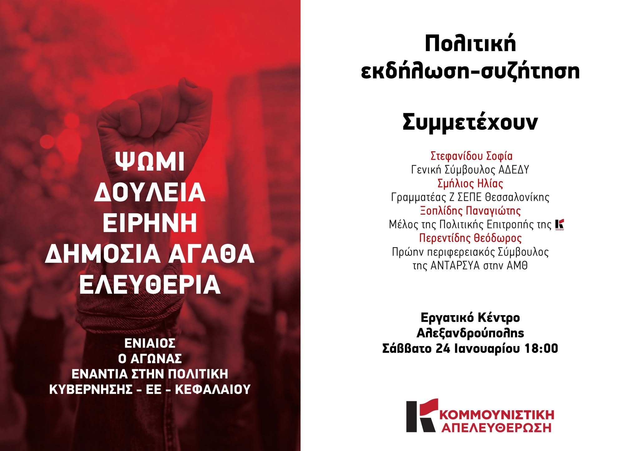 Πολιτική εκδήλωση–συζήτηση με αιχμή τα ζητήματα της εργασίας, της ειρήνης, των δημόσιων αγαθών και της ελευθερίας διοργανώνεται στην Αλεξανδρούπολη, το Σάββατο 24 Ιανουαρίου, στις 18:00, στο Εργατικό Κέντρο Αλεξανδρούπολης.