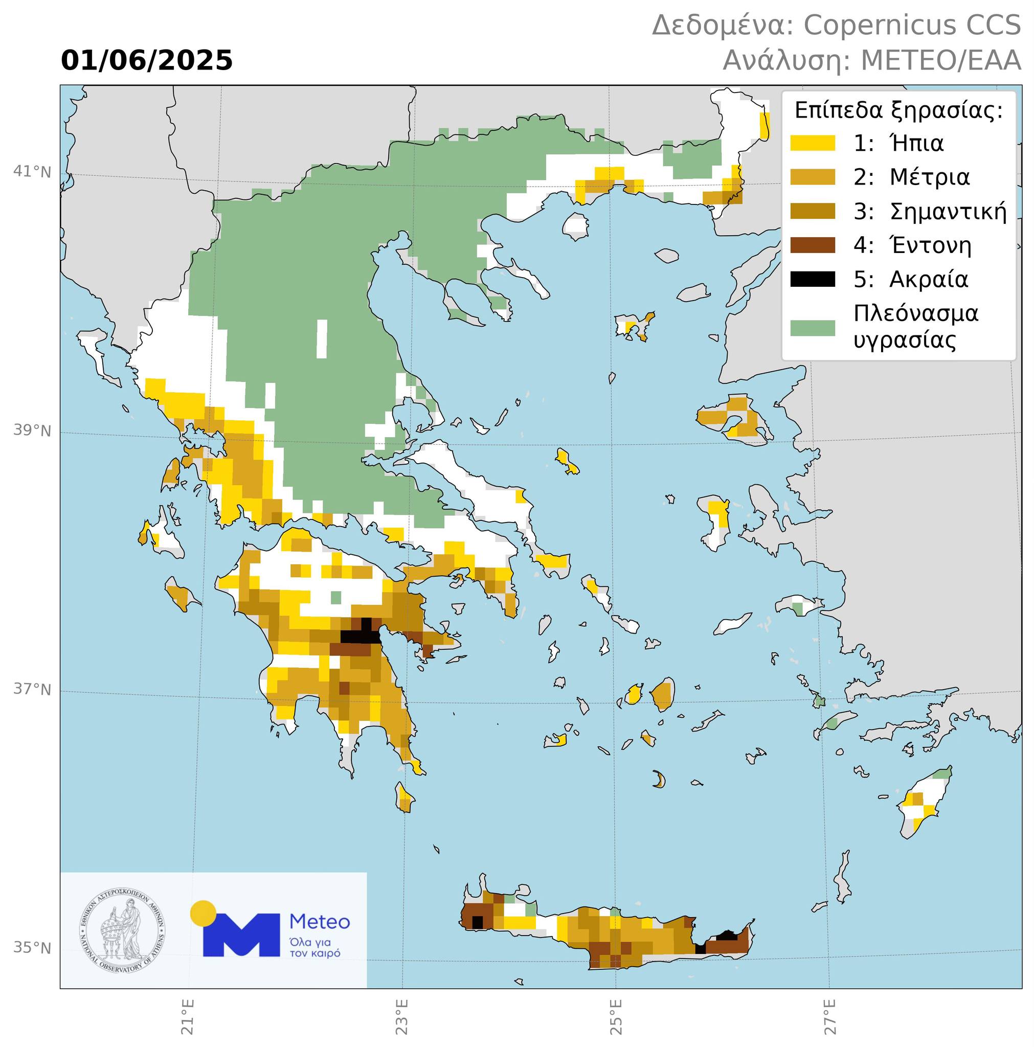Το σύστημα Copernicus CCS αξιολογεί την ξηρασία σε πέντε επίπεδα (ήπια έως ακραία), και για το 2025 χρησιμοποιείται σύγκριση με τις κλιματικές συνθήκες της περιόδου 1991-2020.