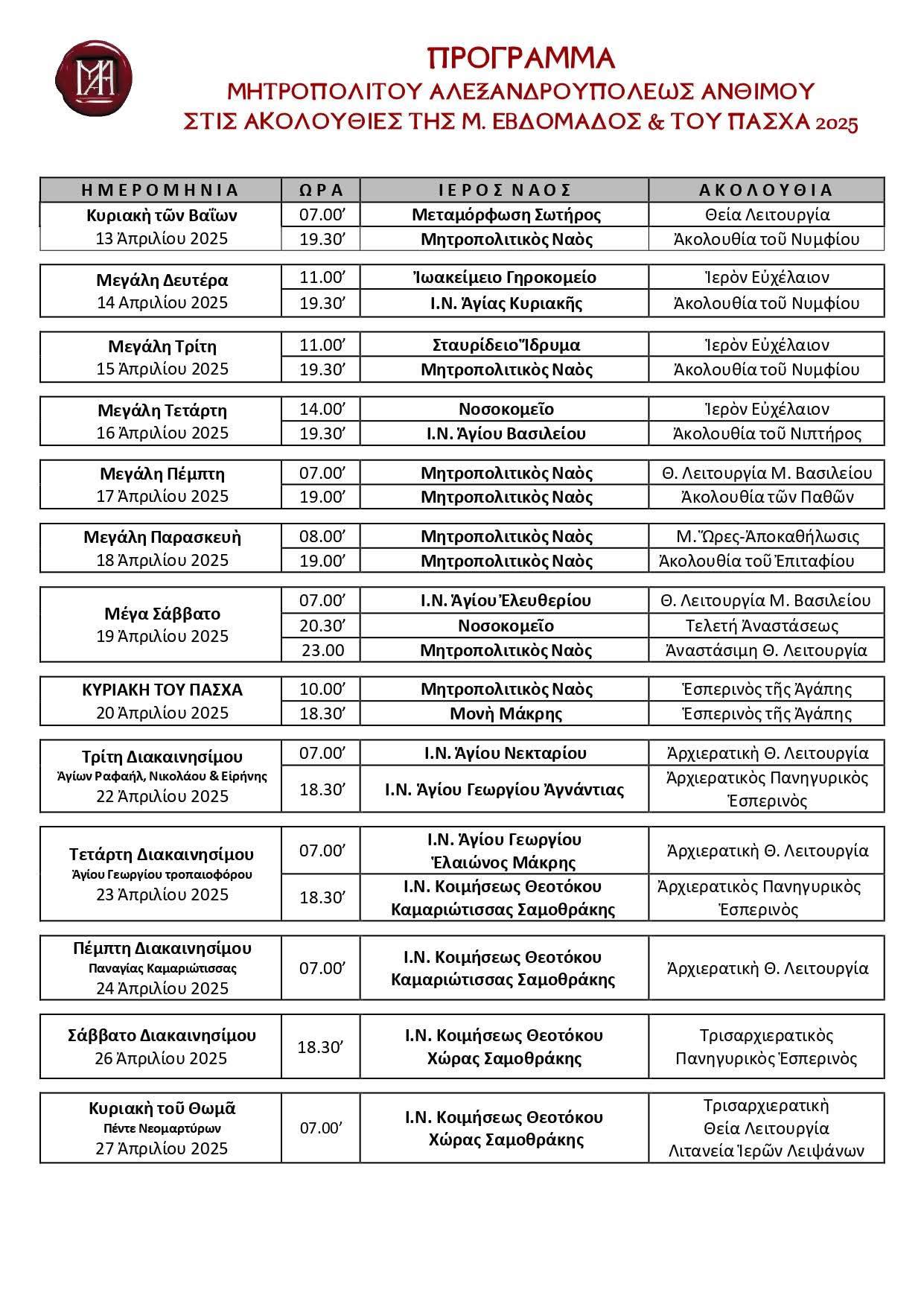 Ανακοινώθηκε το αναλυτικό πρόγραμμα του Σεβασμιωτάτου Μητροπολίτου Αλεξανδρουπόλεως κ. Ανθίμου για τις Ιερές Ακολουθίες της Μεγάλης Εβδομάδας και του Πάσχα 2025.