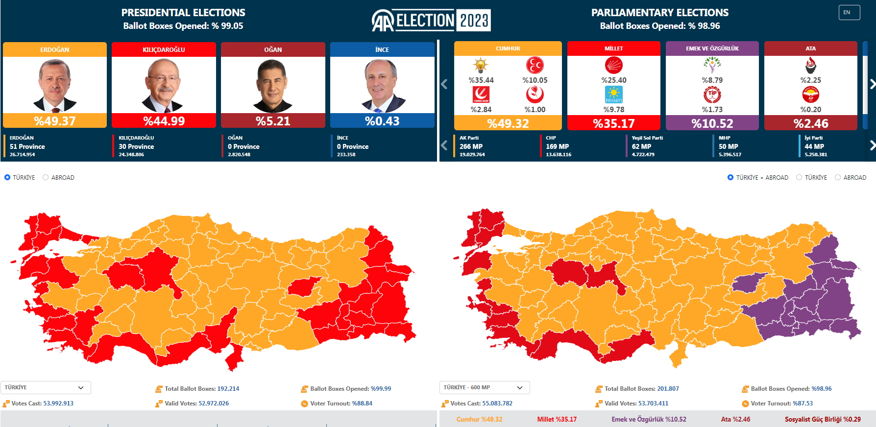 Όμως, κατά τα αποτελέσματα με το 99,05% των ψηφοδελτίων να έχει καταμετρηθεί, λάμβανε μόλις το 44.99% των ψήφων ως τις 03:30 [τοπική ώρα και ώρα Ελλάδας]. Η συμμαχία του αμφισβήτησε αμέσως τον αριθμό αυτό, υποστηρίζοντας πως αποκρύπτεται μέρος των ψήφων υπέρ του από τα συστήματα του ανώτερου εκλογικού συμβουλίου (YSK, η εθνική εφορευτική επιτροπή της Τουρκίας).